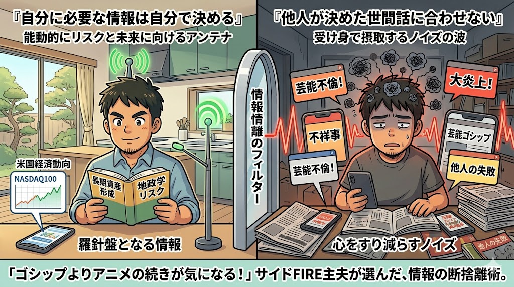 中東やアメリカといった地政学的なリスク、市場の変動、経済動向といった「自分の人生に直結する重要な情報」は、自分から能動的に取りに行きます。これらはノイズではなく、未来のための羅針盤だからです。