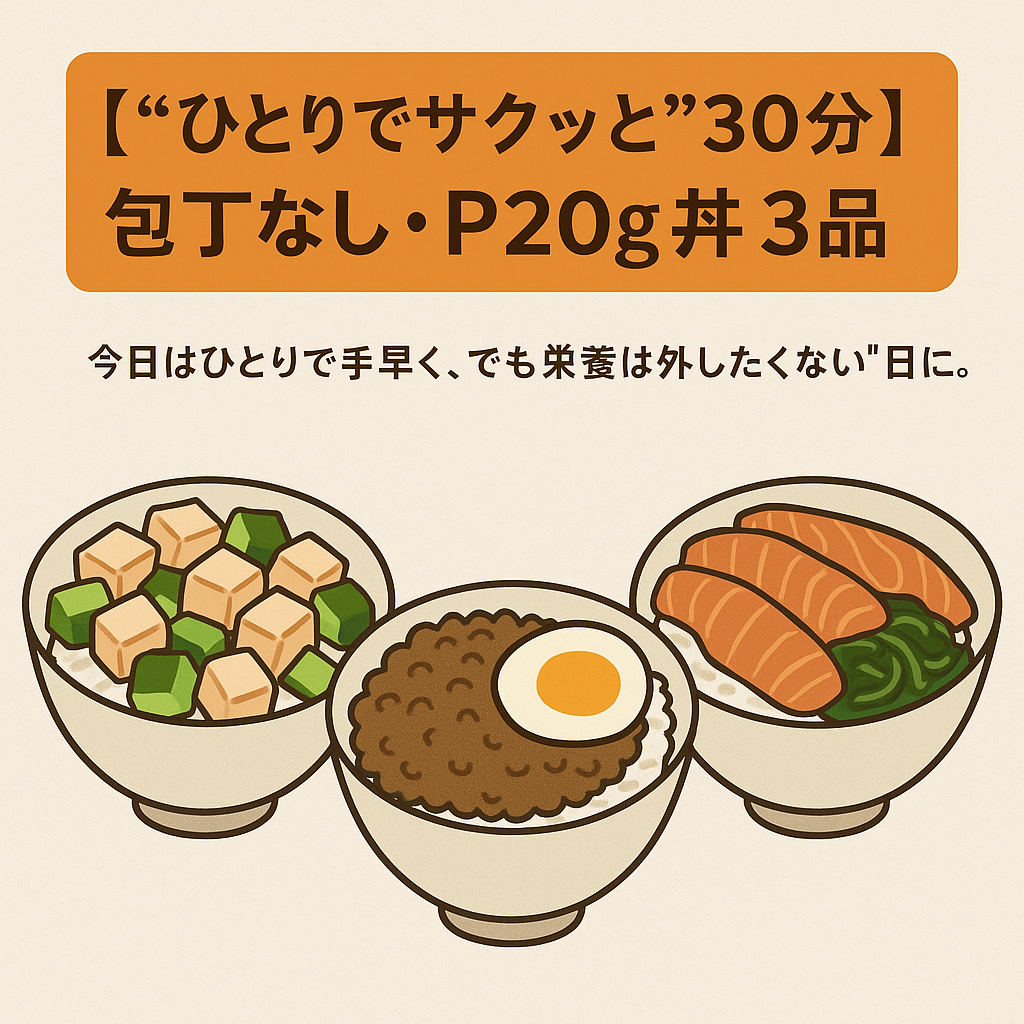 **包丁なし/30分以内/タンパク質20g以上**を満たす“ソロ丼”の決定版を用意しました。