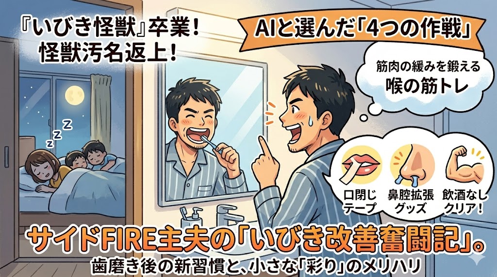サイドFIREして2年目、ストレスも減って健康的な生活を送っているつもりでしたが、どうやら「夜の自分」まではコントロールできていなかったようです。家族の安眠を奪うのは、主夫として、そして一人の人間として見過ごせません。