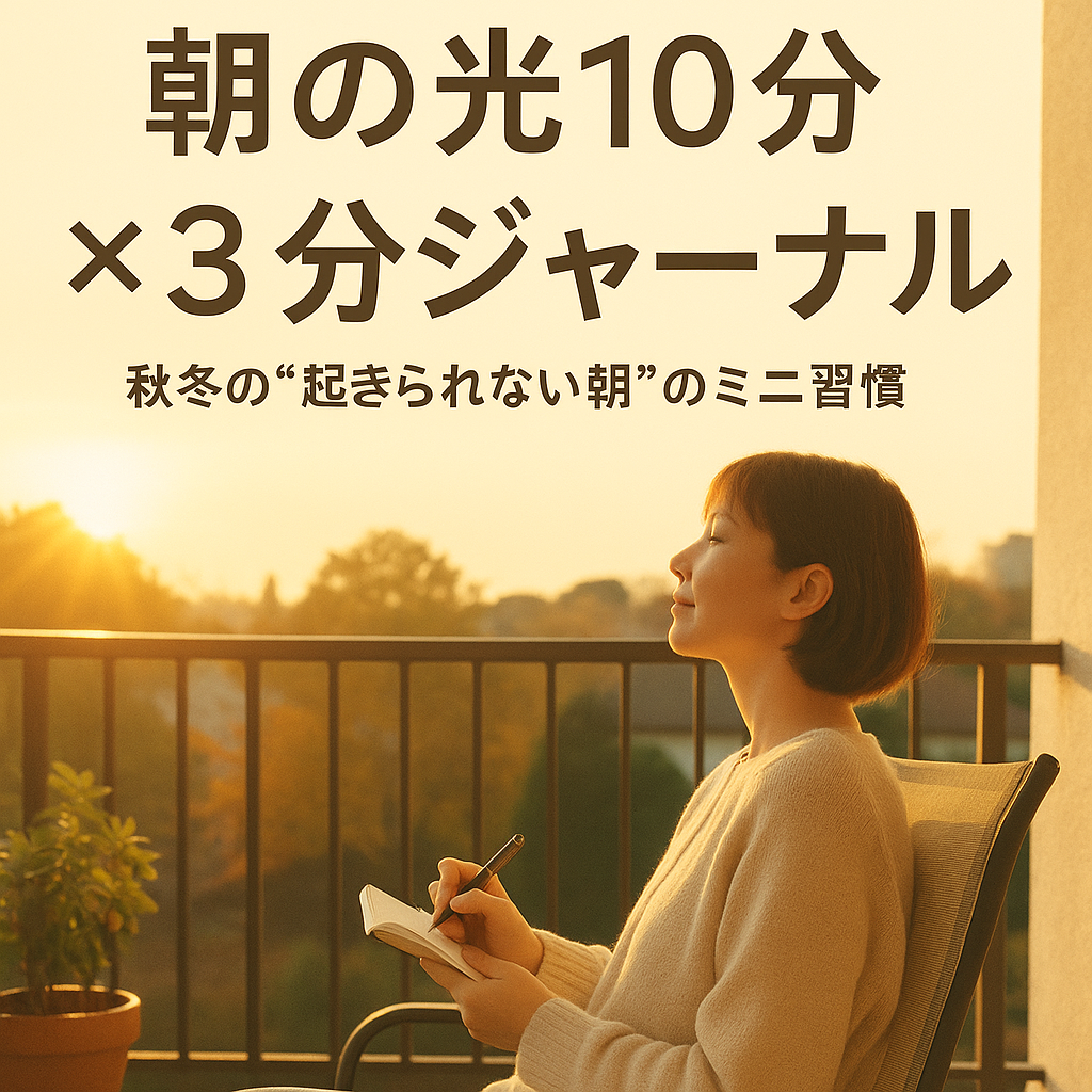 秋冬になると、朝が重くなりがち。カーテンを開けるだけでは起きられない——そんな自分に効いたのが、**「朝の光10分」×「3分ジャーナル」**のコンボでした。場所は**ベランダ/窓辺/玄関前**の“どこかでOK”。光を浴びながら、A6ノートに3分だけ書く。これを**毎朝の最小単位**にします。